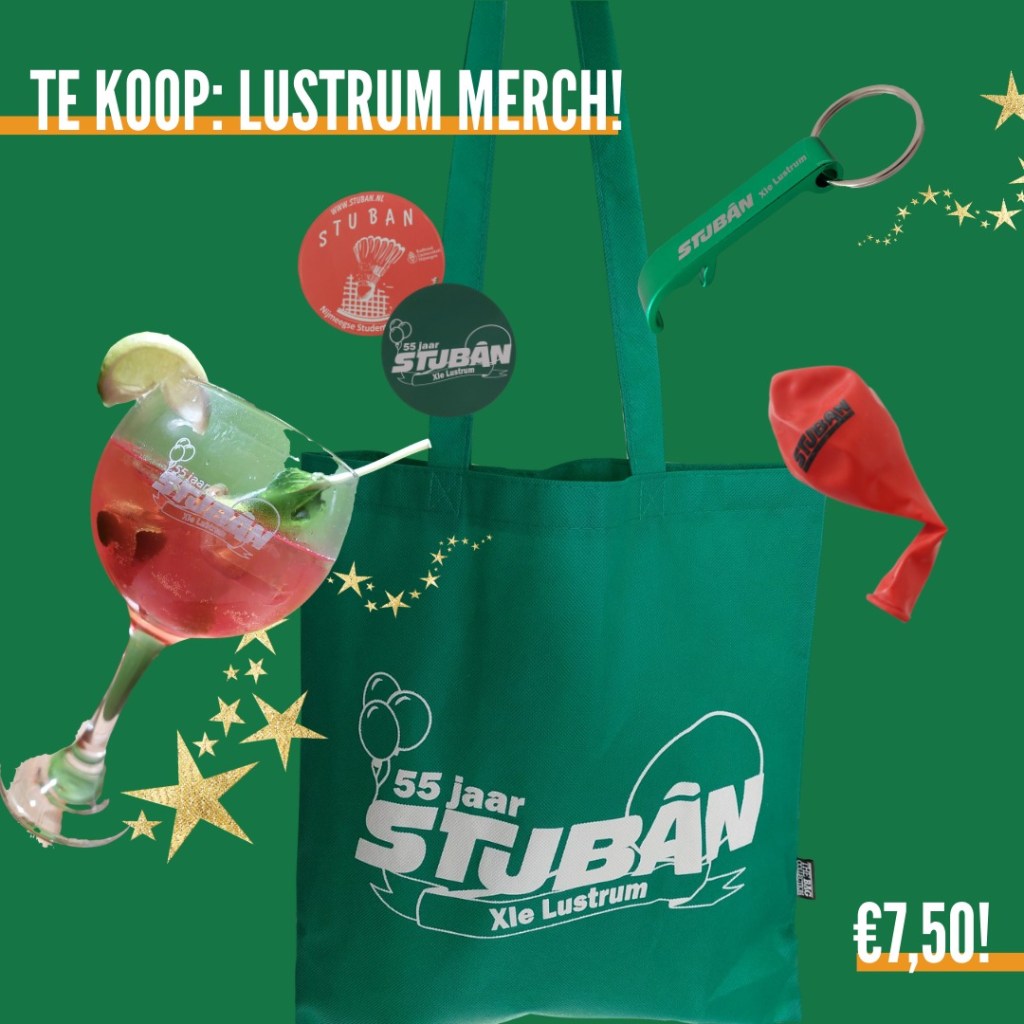 In the meantime, we are offering very nice lustrum merchandise! For only €7.50 you will receive a lustrum bag including a cocktail glass, beer opener, stickers, cocktail recipe and balloon. You can order via this link.