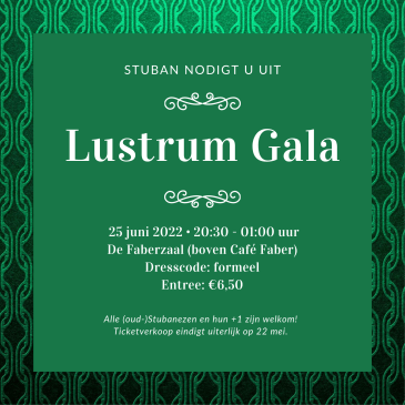Op 25 juni 2022 zal het Lustrumgala plaatsvinden! Dit evenement zal het hoogtepunt zijn van het gehele Lustrumjaar. Het belooft een sfeervolle avond te worden vol muziek, elegante kleding, drankjes, hapjes en elkaars gezelschap. Alle Stubanezen en oud-Stubanezen zijn van harte welkom. Bovendien mag elk van hen één gast meenemen die geen lid is (geweest) van Stuban. … More Koop hier je tickets voor het lustrumgala!